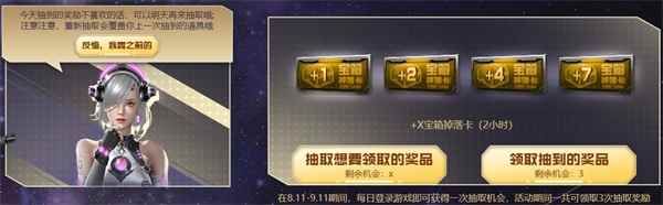 8月11日-9月11日,每日登录游戏,当天都能获得一次抽取机会,活动期间一共可以领取3次。如果你对抽到的奖励不喜欢,也可等待一天后再次抽取,直到奖励满意后领取,不过要注意,重新抽取会覆盖上一次的抽取结果,所以一定要谨慎选择。