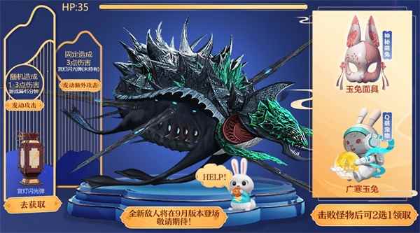 原来贪玩跑丢的玉兔,是被奇异的怪物绑架了,各位玩家快击败怪物,救出玉兔吧! 只要各位玩家每天游戏满45分钟,当天可以进行1次攻击,造成随机1~3点伤害。持有宫灯闪光弹后,可令怪物产生眩晕,每日游戏满45分钟后可额外攻击1次,必定造成3点伤害。 相信你将很快击败这只35血的怪物,在全新玉兔面具与Q萌宠物广寒玉兔这两个奖励中,挑选一个领取吧!