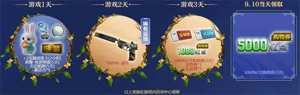 游戏3天领浓情三重礼 9月3日至9月7日,只要你在逆战中游戏累计游戏天数,即可领取浓情大礼: 游戏1天,可以领取+2宝箱掉落卡(2小时)、高爆-兔饼萌雷(5天)、天启陷阱(5天)、复活币*5; 游戏2天,领FNP45-逐月; 游戏3天,还有1000NZ点购物券(3天)、宝物券*1、礼品券*1等你拿。 如果你在9月10日当天登录游戏,还可以领取5000NZ点购物券(3天)。