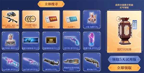 而在9月10日,还有全新特效近战月宫斩斧首发,记得参与活动领取! 找玉兔领全新面具 从9月1日起,来逆战找回月宫里跑丢的玉兔,就可以获得随机奖励。 各位玩家只要在活动期间,每进行30分钟游戏,就可以进行1次搜寻,获取随机奖励,每次获得的奖品不重复,每日最多可进行2次搜寻。 奖励包括逐月系列2选1:AK47-逐月、逐月飞扇,1000勇气徽记(3天)*3,宝物券*1,礼品券*1,火狐-如歌(5天),魂灵使者-薇拉(5天),陷阱全能体验卡(1天),天赋满级体验卡(1天),柯尔特-梦幻(5天),高爆手雷-梦幻(5天),Scar朱雀-梦幻(5天),AK白虎-梦幻(5天),魂灵役主(5天),离震双法战术终端(5天),星光炮(5天)。 如果你获得了全部的搜寻奖励,还可以领取中秋专属投掷物——宫灯闪光弹。