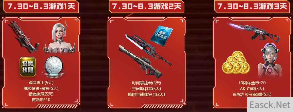 随着终极毕业登场,还有登录奖励可以领取! 在7月30日至8月3日,各位玩家只要游戏1天,即可领取魂灵役主(5天),魂灵使者-薇拉(5天),猎魔执照(5天),复活币*10枚。 在7月30日至8月3日,只要游戏2天,还有时间掌控者(5天),空间撕裂者(5天),陷阱全能体验卡(2天)可以领取。 在7月30日至8月3日,只要游戏3天,10周年金币*20,AK-白虎(5天),白虎之灵-菲欧娜(5天)千万别错过