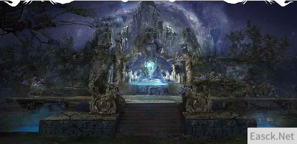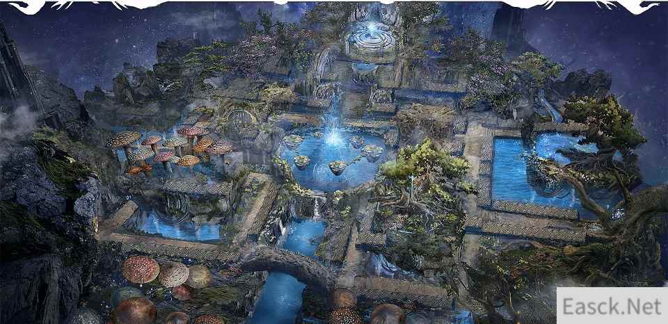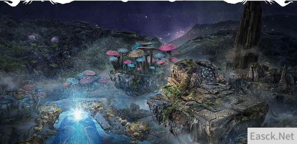 场景中这道绽放着幽蓝色光芒的阵法,巨石林立,奇幻而又不失庄严,同时周围还覆盖着一丛丛巨大的七彩灵菇,为这片巨兽脊背上的巨石丛林添加几笔神秘色彩。