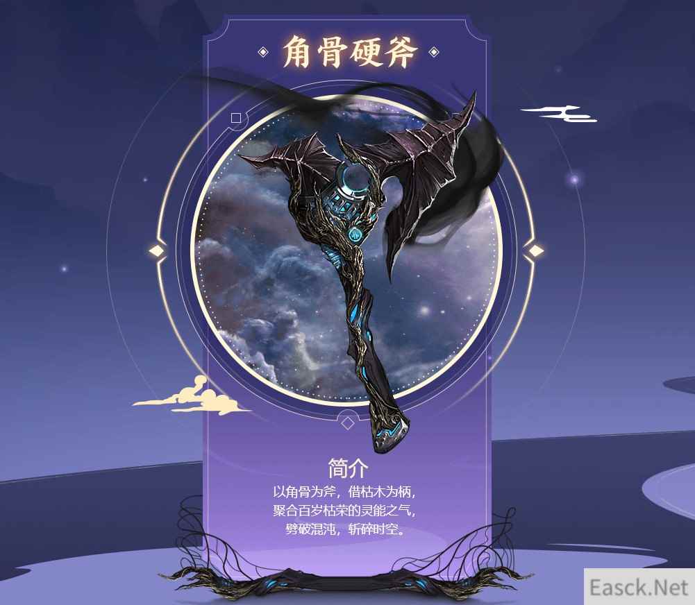 它是在这巨兽之城上吸取精华而生出的灵兽,身体由枯木与精钢虬结成,脸上带着鹿兽面具,它的核心散发着幽兰的能量光团,看上去极具破坏性。 不光如此,它还拥有多种能力:枯木吸灵、哭嚎深渊、暗影星锥、暗影袭杀和巨力强推,通过文字描述,便可以看出既有远程攻击又有近身攻击,还有群攻技能,看来这次逆粉们又有新的难度挑战了。 全新掉落 上古利器 说完BOSS介绍,就到了各位玩家们最关注的掉落环节了,专属掉落! 这次全新塔防有两件专属掉落物品 「角骨硬斧」