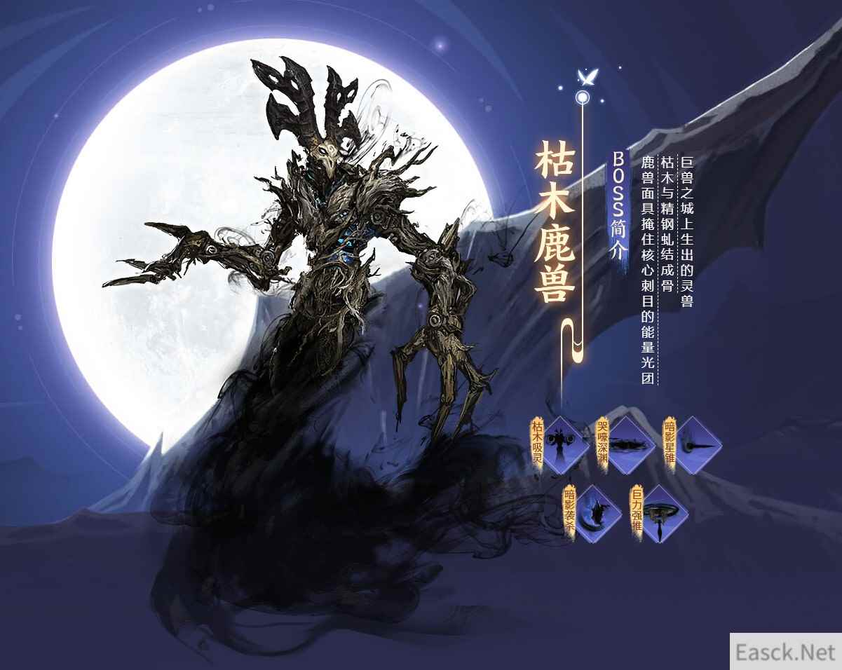 在种种神秘的环境营造下,这一次鲲系塔防把中国风和奇幻元素做到了很好的融合,这次逆战的策划们铆足了劲,想给广大逆战玩家一场绝美的视觉体验。 永恒森林 鹿兽枯木 新地图也有新BOSS——从鲲兽灵气中诞生的枯木鹿兽。