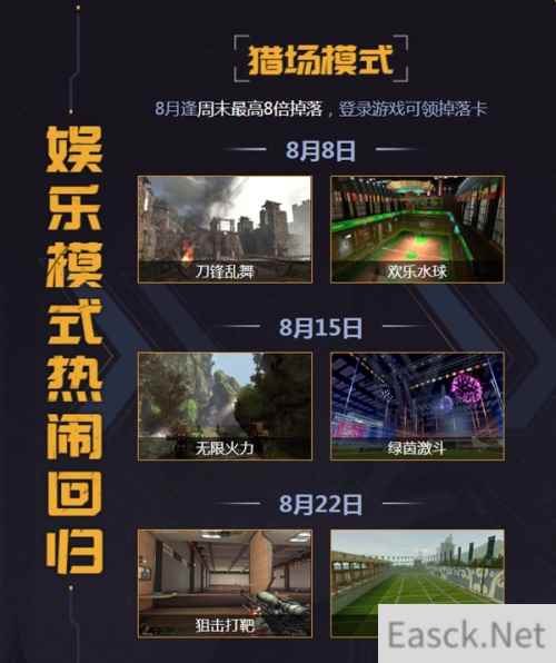 喜爱逆战的小伙伴们都知道,逆战不仅有的PVP竞技模式,僵尸猎场、塔防等PVE闯关模式,还有诸多休闲娱乐的游戏模式,为玩家们不同的喜好提供了多样性的选择,而那些限时开放的特别娱乐模式更是深受玩家的喜爱。8月逆战将开启6大热门特别模式,从而为大家带来更加畅快的游戏体验,其中:8月8日将开启刀锋乱舞模式和欢乐水球模式;8月15日将开启无限火力模式和绿茵激斗模式;8月22日将开启狙击打靶模式和射箭模式。并且整个8月期间每逢周末登录即可领取掉落卡,最高可获得8倍掉落。 8月重点福利大合集 一直以来逆战都不吝啬给玩家送福利,这个八月更是好礼多多。开启鎏金记忆活动,收集纪念卡牌即可兑换霸气的永久纪念版黑金冥王剑;8周年最强庆典福利活动,不仅8月8日登录即送永久,更有28大永久任你挑选;永久神器免费升级活动,488神器心灵守卫免费升级为心灵战警,还有亮晶晶的永久灵剑古月相送。