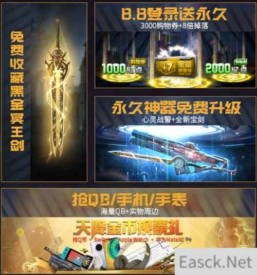 很多细心的小伙伴发现自己在这段时间获得了纪念币和Q币兑换券,却不知道怎么使用,那么我来告诉你,8月期间只要玩家在僵尸猎场、塔防、无尽塔防、欢乐防线、普通爆破、普通团队竞技、个人竞技7个模式中游戏就可以掉落纪念币和Q币兑换券,前往天降金币换豪礼活动,不仅能够兑换游戏道具,还能抽取Q币,华为Mate30 Pro手机、任天堂Switch NS游戏机、智能手表、游戏外设等实物大奖。