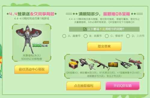新版本非常值得期待,自是不必多说,我们继续回归踏青豪礼,4月4日至4月12日,暖春踏青活动特设答题抽奖环节,在本环节每天参与答题,答对即可抽奖,答错可重选,答对为止,无重复抽取,6次必得所有奖励,QB宝箱顾名思义用于抽取QB。不仅如此,4月4日至4月6日期间,完成任意一局游戏还获得全新永久道具——风筝背包以及5000NZ点购物券哦!