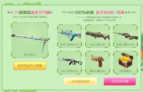 紧接着4月11日将开启100%必得永久95式-花间活动,又是一波永久福利,4月11日当天完成任意一局游戏,便可直接领取威力不凡且造型清醒脱俗的永久道具——笛子。4月11日至4月19日期间每天完成1局游戏即可抽取1次,无重复抽取,抽取6次100%必得!在本环节不仅可以100%获得限时神器纪元之辰、MSR-鹰王、AK-白虎、黄金之翼,还有QB宝箱三个以及95式-花间(永久)。