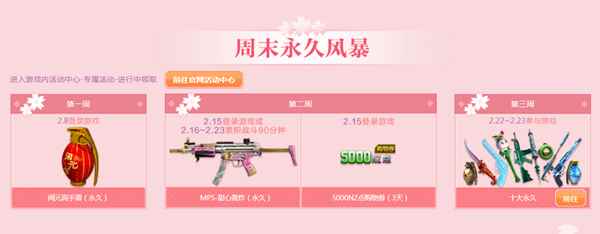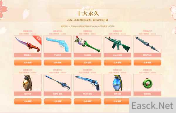 2.22-2.23十大永久万份抛洒 活动第三周(2月22日-2月23日)每次10点-23:59:59将开启十大永久免费领取环节,此环节玩家每天登陆一次,可任选一件领取(每天最多领1件)每小时平均限量,总数量高达10000件。其中全新永久道具——狩猎甜心(1000份)、左轮冰雪(1000份)、白山娃娃(1000份)、M4A1-咏歌(1000份)、阴阳两仪伞(1000份)、鬼炎手雷(1000份)、巴雷特-碧海(1000份)、M500-碧海(1000份)、碧海手雷(1000份)、备胎背包(1000份)。