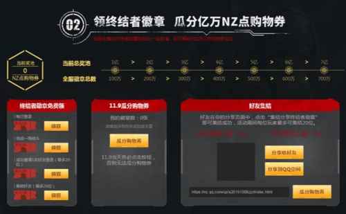 领终结者徽章 瓜分亿万NZ点购物券 在本环节中官方设立了高达7亿NZ点购物券的超大奖池,玩家通过每日登录游戏、完成一场战斗、邀请好友登录、集结好友等方式领取终结者勋章,当全服务器内收集的终结者勋章数量达到100万-700万枚,将对应解锁1亿-7亿NZ点购物券奖池。抽奖于11月9日开启,当天进入活动专题,点击瓜分购物券,即有机会获得海量购物券,收集的终结者勋章越多,获得高额购物券几率越大!(据小道消息,全服第700万枚勋章收集者,有额外惊喜哦。)