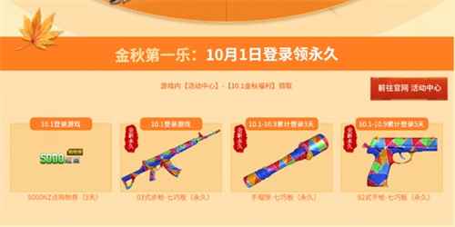 金秋第一乐:10月1日登陆领永久 本次金秋七重乐第一站就非常给力,10月1日只需登录游戏就可以领取全新永久武器<03式步枪-七巧板>,以及5000NZ点购物券(3天);不仅如此,本次的全新永久七巧板可是主、副、手雷三件套哦,10月1日-10月9日累计登录3天,即可领取<手榴弹-七巧板(永久)>、累计登录达到5天即可领取<92式手枪-七巧板(永久)>集齐套装了,获取方法真的是轻松加愉快。