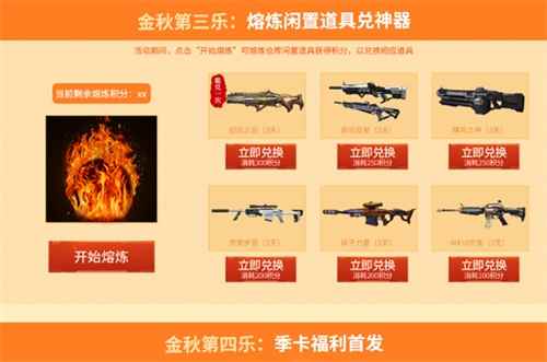金秋第三乐:熔炼闲置道具兑神器 活动期间登录逆战官网,进入金秋送爽7重乐,点击三重乐“开始熔炼”可熔炼仓库内闲置道具获得积分,积分可用于兑换:纪元之辰、泰坦双星、飓风之神、奇变步狙、原子力量、M416炽鬼等神器,准备好清仓吧。
