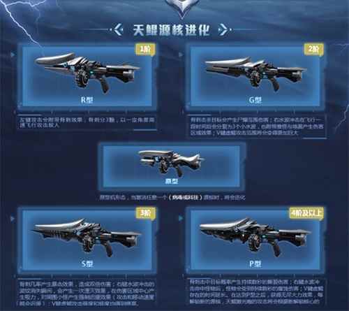 同时,天鲲套同样提供了新的源核进化,主武器天鲲激光炮可以进化成4阶及以上,同时也就有了四种形态。 1阶-R型:附带骨刺效果。 2阶-G型:骨刺击杀后附带爆炸效果;水波冲击加强;V键虚鲲范围扩大。 3阶-S型:骨刺几率附带暴击效果;水波攻击附带迟缓效果;V键虚鲲攻击强度增强。 4阶-P型:获得无尽效果;骨刺附带持续撕裂伤害;水波攻击附加腐蚀效果;V键虚鲲攻击时间延长;攻击会随着吞噬的源核不断强化。