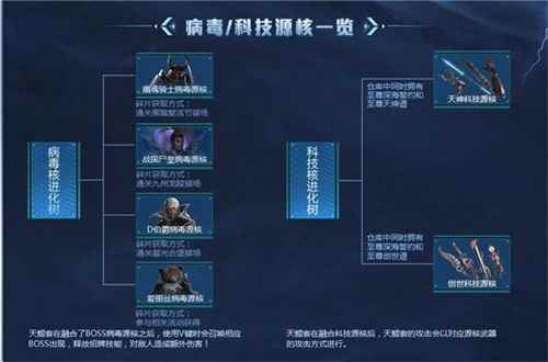 天鲲套能吞噬两种源核,病毒核和科技核,吞噬病毒核可以在V键攻击时召唤出相应的BOSS出现进行招牌技能攻击,例如幽魂骑士的幻象真身,体型庞大,技能十分酷炫;病毒核有幽魂骑士、战国尸皇、D伯爵和爱丽丝。科技核则是天神套和创世套,吞噬相应的套装之后天鲲套的攻击会以对应的源核武器进行。