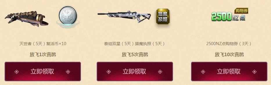 三、活动规则 1、放飞喜鹊机会每日清空,请当日使用。第一部分为全员放飞喜鹊进度,当全员放飞进度达到100%(放飞1000万喜鹊),即可领取永久专属双持UZI; 2、【个人奖励】栏目内奖励只能领取一次 |