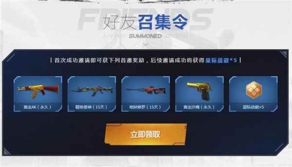 1、活动时间: 2、成功邀请玩家将会获得星际战徽,被邀请玩家完成相应任务,邀请人和被邀请人均可获得星际战徽,星际战徽可用于页面兑换极品奖励; 3、赠送给好友的奖品(Q币、神器),需好友成功接收邀请后在对应的新/老兵页面领取; 4、在绑定服务器下无角色时游戏道具将无法发放成功,同时游戏内道具发放可能略有延迟请重新登录游戏或与24小时后登录游戏查看; 5、部分道具为限量道具,先到先得,部分道具为限兑换次数道具,仅可兑换一定次数;