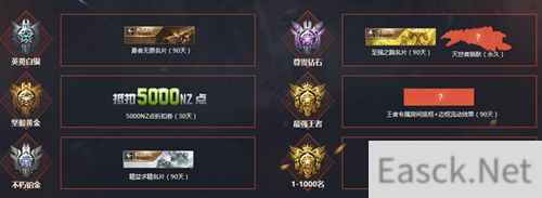 英勇白银:勇者无畏名片(90天) 坚毅黄金:5000nz折扣点(30天) 不朽铂金:精益求精名片(90天) 尊贵钻石:至强之路名片(90天)、灭世者皮肤(永久) 最强王者:王者专属房间底框+边框流动效果(90天) 1-1000名:猎场之王称号(90天) |