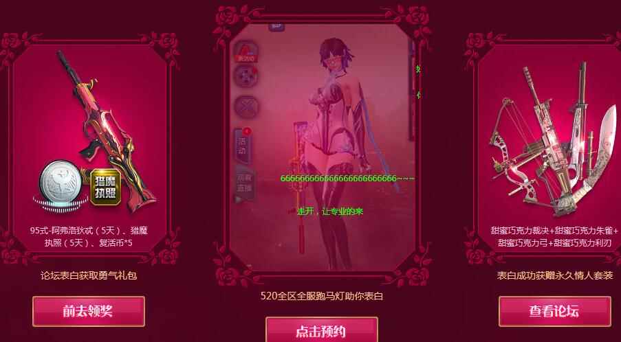 活动时间:2018年5月11日-5月20日 活动地址:http://nz.qq.com/cp/a20180426love/index.htm 表白墙 发出表白,就有机会上逆战跑马灯,全区全服为你表白加油