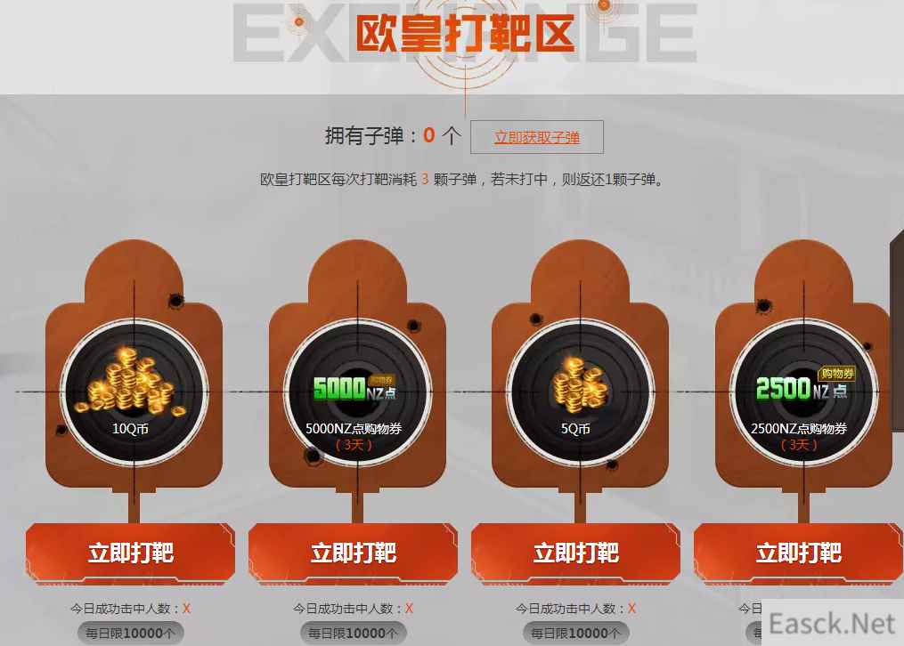 逆战我们都是神枪手活动地址2018 点击进入 1.欧皇打靶区每次打靶消耗 3 颗子弹,若未打中,则返还1颗子弹。