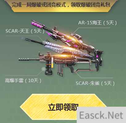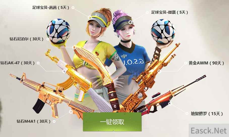 活动时间:2018年4月3日-5月7日 活动地址:http://nz.qq.com/cp/a20180315lxhd/index.htm 活动内容: 注册角色 送豪华钻石武器套+神器地狱修罗+黄金AWM+两位足球宝贝(4月3日后新注册《逆战》的玩家可领)