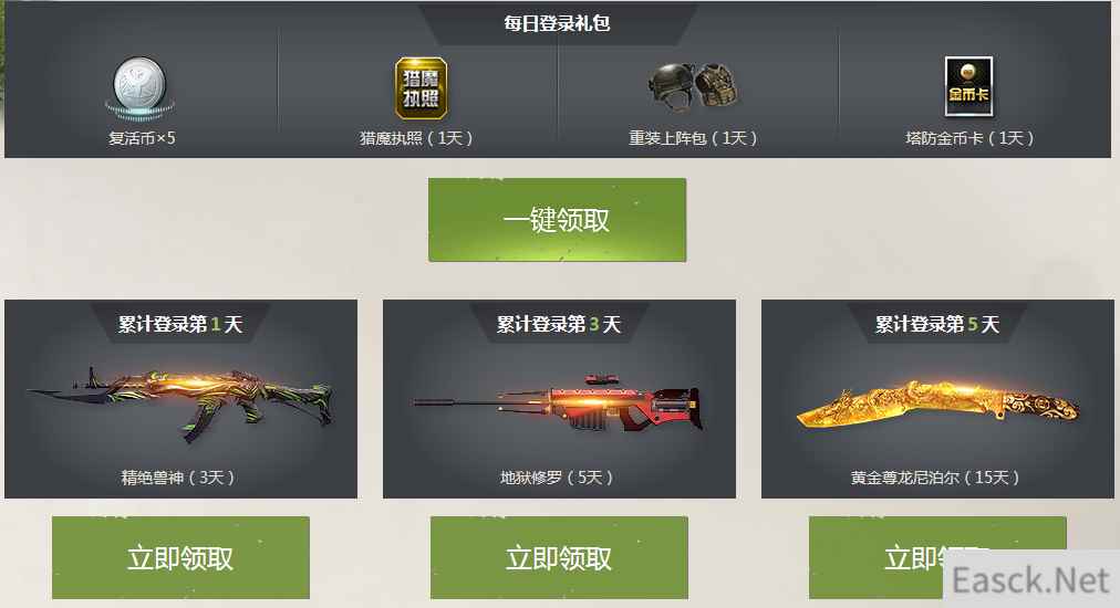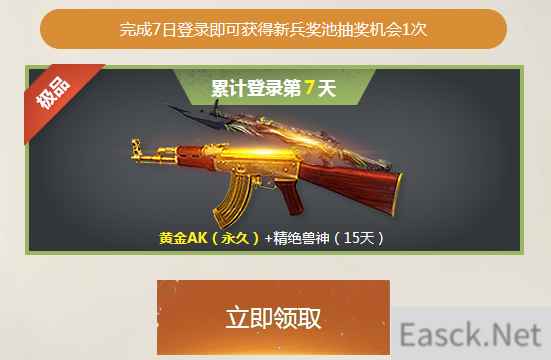 登录7日,必得黄金AK永久+极品猎场神器 新兵累计登录可即可领取超级大礼,每日登录可领每日登录礼包