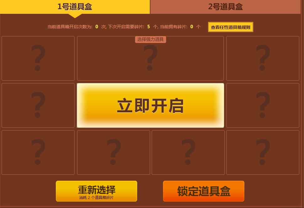 活动规则: 1、活动时间:2018年3月28日 - 2018年5月3日; 2、活动结束后,5个工作日内,玩家尚未消耗的碎片将直接转换为对应的NZ点并发放至游戏内仓库,1道具箱碎片=1000NZ点; 3、在道具箱中选定强力道具后,其他8个道具将随机生成。随后玩家可选择【锁定奖池】开始抽奖,或【重新选择】消耗2个碎片清空奖池重新定制道具箱内容,开启抽奖后无法重新选择。每个玩家最多定制2个道具箱并最多获得18个道具,每个道具箱有2次重置机会 ; 4、每次开启将不会重复获得道具箱内已抽到的道具,每个道具箱开启9次100%获得全部9个展示的道具, [概率公示明细]; 5、如玩家已拥有抽取到的相同道具或同类别永久道具,则可以选择返还碎片或领取道具,时限类道具及复活币不适用该规则,内已拥有奖池内唯一道具的用户,在获得时将直接返还消耗的碎片,不会重复发放,成功获得【地狱烈焰犬】道具后,将于活动结束后的5个工作日内发货到账; 6、获得原子力量/泰坦双星(皮肤版)的玩家可在游戏内将武器拆解为武器及皮肤枪芯,请注意:仓库内同时只能存在一个同样的皮肤枪芯; 7、成功开启炫彩皮肤卡宝箱后,所有获得的换肤卡/购物券/加成卡将于活动结束后5个工作日内发放; 8、在法律允许的范围内,腾讯公司拥有对本活动的解释权。 |