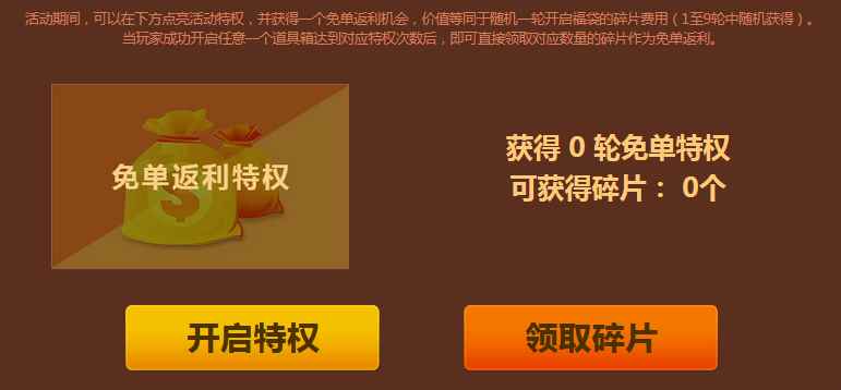 *包含1个复活币+1个宠物盒碎片 免单返利任性送 活动期间,可以在下方点亮活动特权,并获得一个免单返利机会,价值等同于随机一轮开启福袋的碎片费用(1至9轮中随机获得)。 当玩家成功开启任意一个道具箱达到对应特权次数后,即可直接领取对应数量的碎片作为免单返利。