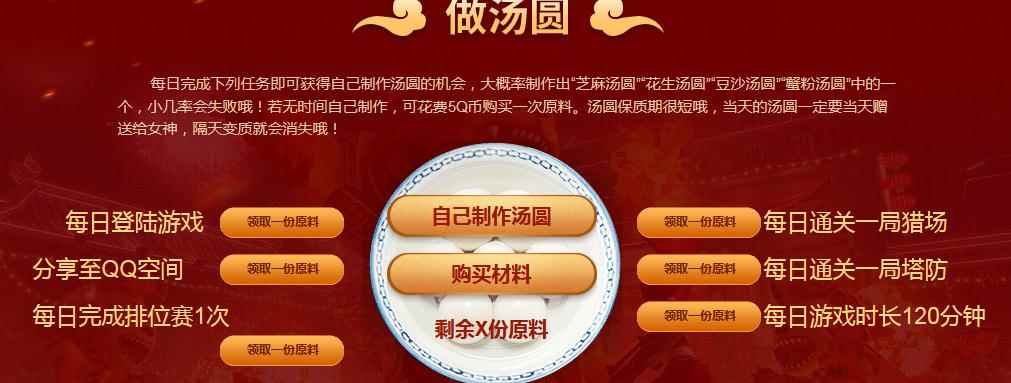 做汤圆 每日完成下列任务即可获得自己制作汤圆的机会,大概率制作出“芝麻汤圆”“花生汤圆”“豆沙汤圆”“蟹粉汤圆”中的一个, 小几率会失败哦!若无时间自己制作,可花费5Q币购买一次原料。汤圆保质期很短哦,当天的汤圆一定要当天赠送给女神,隔天变质就会消失哦!