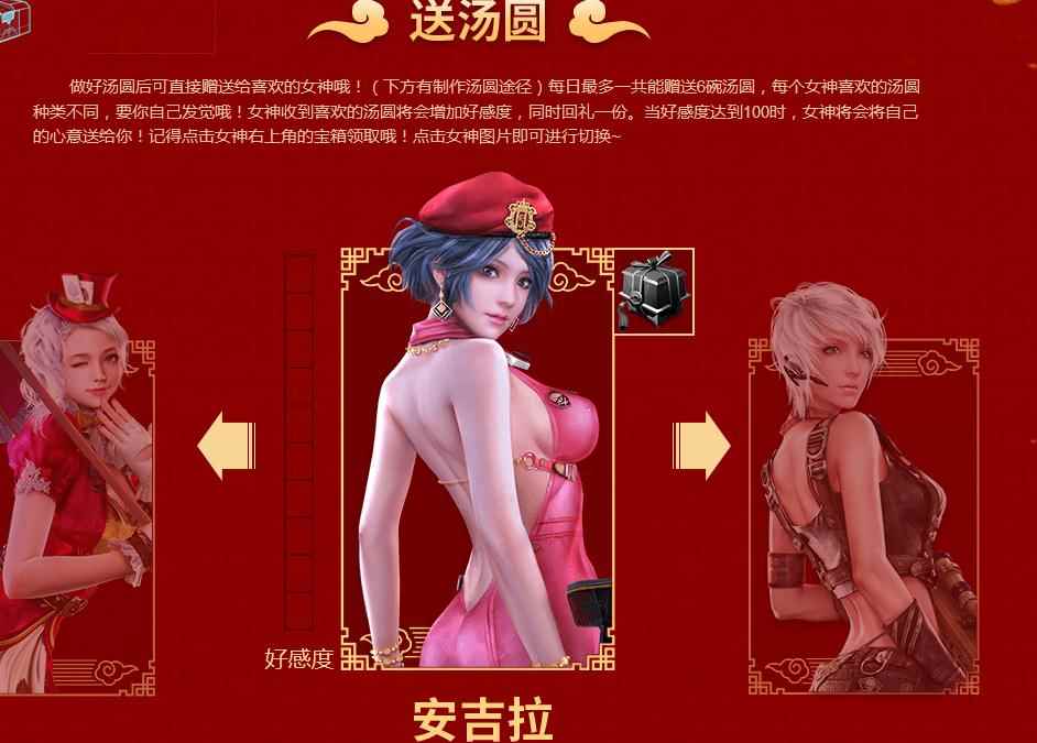 《逆战》元宵喜乐会活动指南 送汤圆: 做好汤圆后可直接赠送给喜欢的女神哦!(下方有制作汤圆途径)每日最多一共能赠送6碗汤圆,每个女神喜欢的汤圆种类不同,要你自己发觉哦!女神收到喜欢的汤圆将会增加好感度,同时回礼一份。当好感度达到100时,女神将会将自己的心意送给你!记得点击女神右上角的宝箱领取哦!点击女神图片即可进行切换~