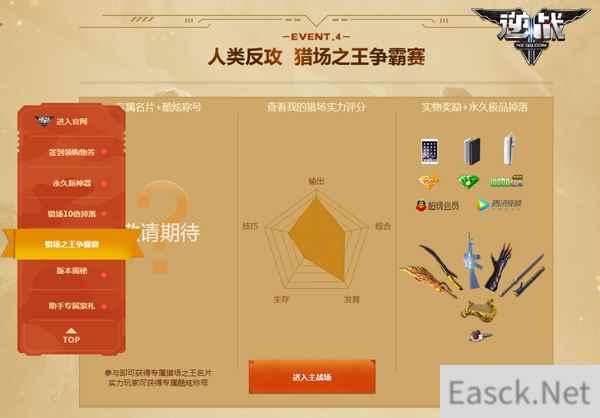 回归老兵享特权 万众期待 PVE猎场排位赛抢先开放 PVE猎场排位赛也将赶在《逆战》五周年盛典前夕正式开放。PVE猎场排位赛活动会在指定时间阶段内开放指定难度地图,首张开放的地图是精绝古城,将在12月12日至12月21日期间开放挑战,玩家可单人、组队、开房参与,成功通关指定难度地图后将能够获得当局排位得分,并在活动页面进行查看、分享和抽奖等操作。玩家每日可多次参与指定猎场挑战,系统将选取每日最高得分进行累计积分,最终排位段位将由玩家赛季内总积分在所有参与玩家的排名分段决定。根据排名,玩家可获得对应的极品道具,如第一名可获得血怨(30天),不仅如此,玩家在限定时间内冲刺排名还可获得神秘的头顶称号。