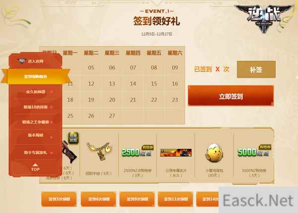 助手专属豪礼 签到领购物券 狂欢盛典已惊喜抢跑 作为《逆战》五周年盛典为玩家带来的第一弹福利,签到领好礼活动已经率先开放。即日起至12月27日,玩家累计登录游戏次数,满足对应的次数要求即可领取到相应的奖励,其中签到达到17次可领取5000NZ点购物券(3天)。