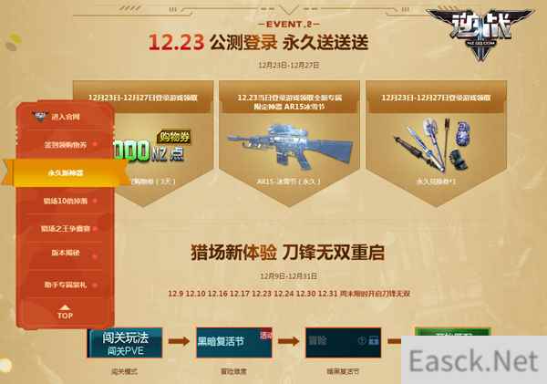 《逆战》五周年公测盛典 【感恩有你 12月23日公测盛典开启在即】 《逆战》五周年公测盛典即将开启,全新专题站抢先上线,海量狂欢内容提前了解。喜迎游戏公测五周年,《逆战》精心准备了多重献礼,在公测当天,玩家登录游戏即可领取到购物券以及全新专属限定神器AR15-冰雪节(永久),12月23日-12月27日期间登录游戏还可继续获得永久兑换券。