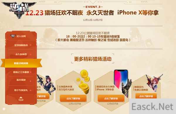 公测登录永久送送送 打造猎场狂欢不眠夜,12月23日公测盛典当天的18:00至次日2:00,游戏多个指定猎场限时5倍掉落,包括大都会、黑暗复活节、丛林魅影、樱之城、雪域迷踪、禁魔岛。除此之外,围绕着猎场,游戏还将同步打造多个福利活动,如猎场狂欢领永久神器、iPhone X,神器签约免费认领等。