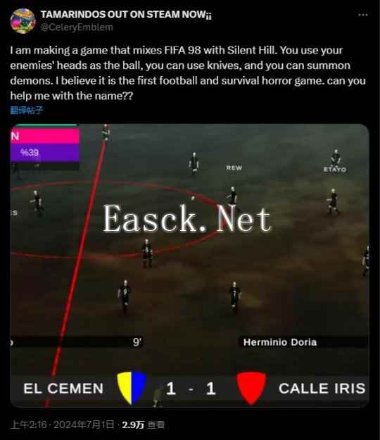 而按照Celery Emblem的说法,玩家将用敌人的头颅当做足球,能使用刀还能召唤恶魔,Celery Emblem现在急需为这款游戏起一个名字,因此公开在网上征集。 虽然游戏并未公布更多具体细节,但考虑到官方表示结合了《FIFA 98》和《寂静岭》的特点,目前已经有玩家建议游戏命名为《Fear-FA(恐惧FA)》、《Silent Nil(寂静零)》和《Heads Will Roll(人头翻滚)》,外媒“The Gamer”还打趣道游戏应该叫做《Dead Ball Specialists(死球专家)》。
