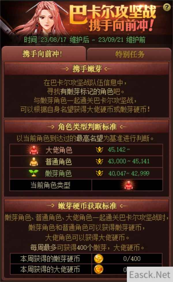 活动期间,游戏角色会根据自身名望值分别被判定为“大佬”、“普通”、“嫩芽”,当上述3种角色一同通关巴卡尔攻坚战时,可以获得对应的活动硬币奖励。