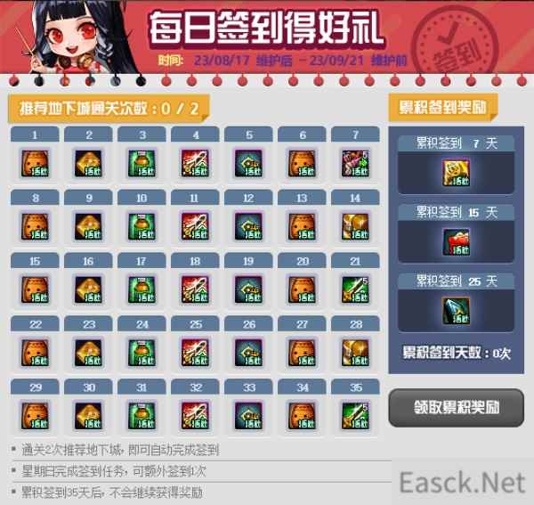 活动期间,勇士们仅需每日通关2次推荐地下城,即可进行签到领取对应好礼,累积签到更有高价值道具等你拿。