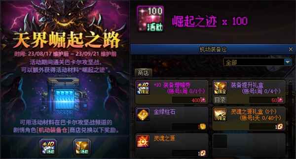 活动期间,参与巴卡尔攻坚战副本并且通关后,每个角色都能获得额外活动材料100个“崛起之迹”,并用其兑换活动商店中的增幅券、装备提升礼盒等给力道具,抓紧机会参与团本攻坚,让自己的角色变得更加强大吧!