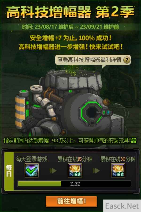 高科技增幅器将在版本更新后再次降临阿拉德,勇士们每天上线积累在线时间都能获得协调结晶体奖励,并且在活动期间进行增幅/安全增幅都能获得更高效率,上线开启自己的增幅变强之旅吧~