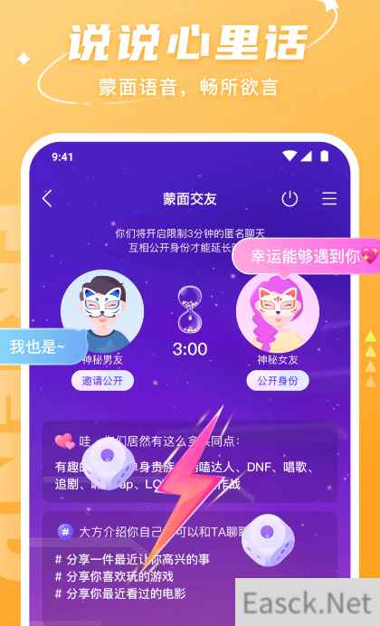 加入Hello语音大家庭,随时都可以遇到让你眼前一亮的好声音,助眠放松、音乐翻唱、甜蜜声线讲述温情趣事;更有快速效率脱单的相亲板块,直接连麦恋爱,CPDD从此告别孤单!