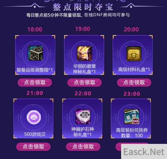整点限时夺宝 每日6点至11点的整点时刻,都能领取对应限时奖励,共有6种不同奖励,包含装备品级调整箱、华丽的徽章神秘礼盒、高级材料礼盒、游戏贝、神器护石神秘礼盒和高级装扮兑换券。对这些奖励感兴趣的用户,记得在整点时刻打开皮皮蟹领取奖励过,丰厚奖励切记不要错过啦。
