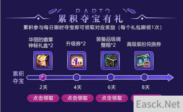 累计夺宝奖励 坚持每日参与整点夺宝活动的用户,累计夺宝天数达到2天、4天、6天和8天时,将解锁对应的累计夺宝礼包,奖励包含华丽的徽章神秘礼盒、升级券、装备品级调整箱和高级装备兑换券!想要拿到这个活动环节的奖励,大家就先要完成整点限时夺宝哦。