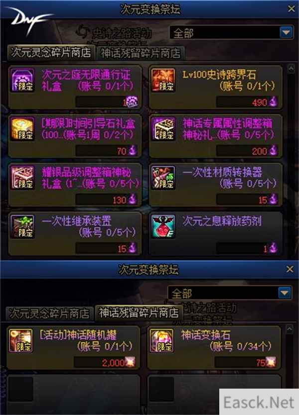 全身装备轻松毕业 角色养成更高效 奖励方面,次元边界产出的神话残留碎片可以在活动商店兑换一个神话随机罐子,开启后可以随机获得1件神话装备。此外,勇士们还可以使用神话残留碎片兑换神话变换石,与刃影之歌活动一样,每次使用神话变换石可以随机变换神话装备,并去除一种不想要的神话装备类型,最终必然获得自己心仪的神话。另一方面,次元灵念碎片商店可以兑换Lv100史诗跨界石、时间引导石礼盒、耀银品级调整箱神秘礼盒、神话专属属性调整箱神秘礼盒、一次性材质转换器、一次性继承装置、次元之息释放药剂等奖励。勇士们还可以使用次元灵念兑换全身12个部位的史诗装备,每个部位的史诗装备每个账号限定获得1次,轻松实现装备毕业。