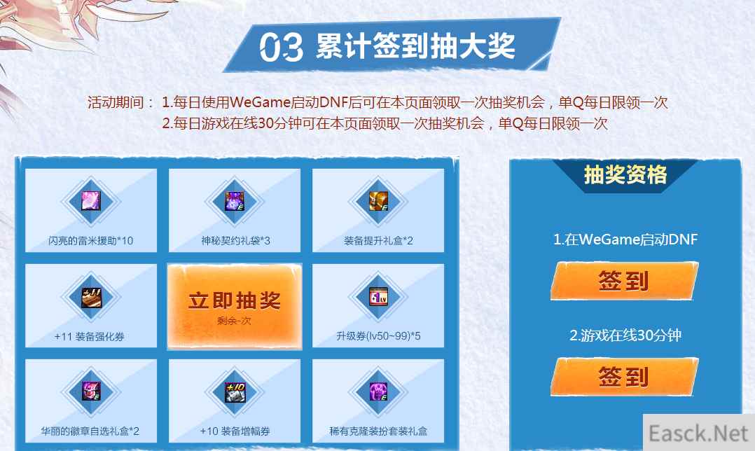 DNF开启了暖冬好礼超爽福利送不停,每天使用Wegame登录游戏就可以进行抽奖,累计一定次数还可以抽取额外奖励,下面就给大家带来DNF暖冬好礼超爽福利送不停活动网址。
