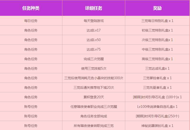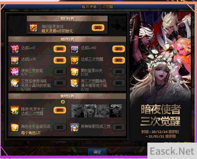 【DNF2021年活动大全 】 活动时间 : 2020年12月24日维护后~2021年1月21日维护前 活动地址:点击查看 三次觉醒后的暗夜使者可以完成各种任务获得奖励,任务分为每日任务,角色任务以及账号任务,每日任务每天可完成1次,每日凌晨06:00重置,角色任务每个角色只能完成1次,账号任务每个账号只能完成1次。