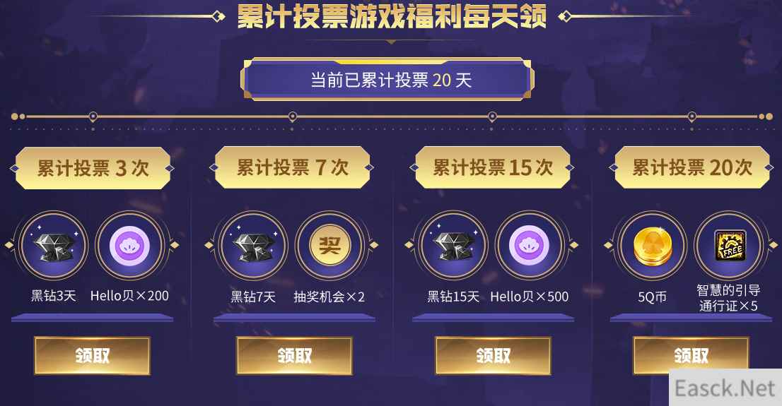 同时勇士们参与跨区投票也可以获得相关奖励,每个用户每天有1次免费投票的机会。累计投票3次可获得黑钻3天、Hello贝x200,累计投票7次可获得黑钻7天、抽奖机会x2、累计投票15天可获得黑钻15天、Hello贝x500,累计投票20次可获得5Q币、智慧的引导通行证x5。
