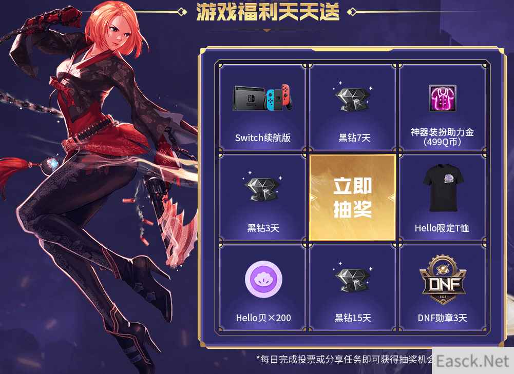 通过完成媒体投票或者分享活动任务,勇士们还可参与“游戏福利天天送”活动,能够进行幸运大转盘抽奖。奖池中有多种好礼,比如说存在Swtich续航版、神器装扮助力金(499Q币)、Hello限定T恤、黑钻15天等等。