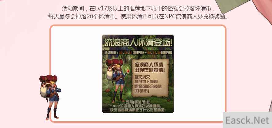 DNF开启了流浪商人怀清登场,活动期间玩家可以在推荐地下城获得怀清币(每天最多20个怀清币),使用怀清币可以在商店兑换奖励,下面就给大家带来DNF流浪商人怀清登场活动网址。