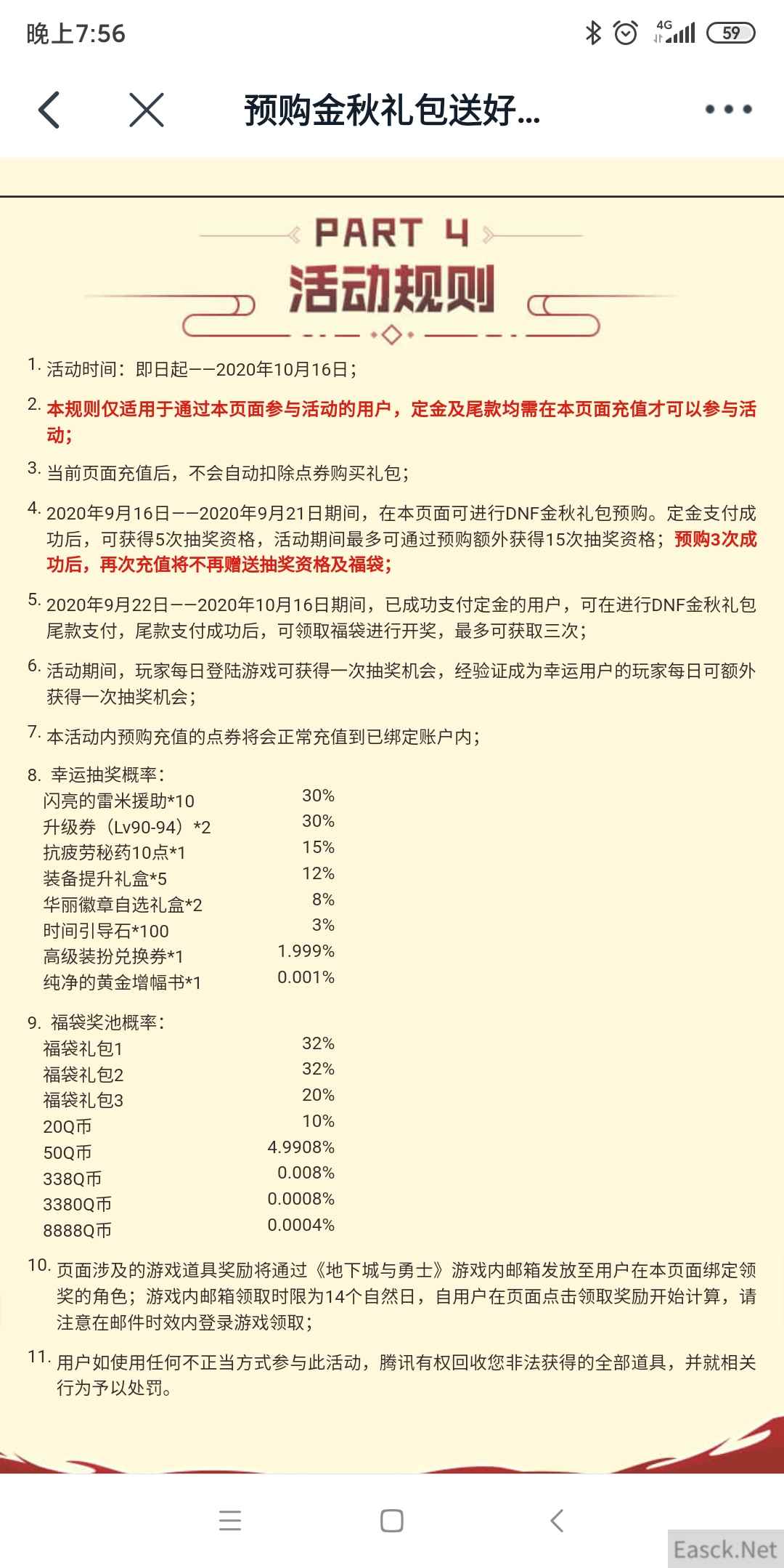 【DNF2020年活动大全 】 预购金秋礼包送好礼活动 活动时间:9月17日~10月16日 活动网址:点击查看(建议使用手机查看) 活动奖励: