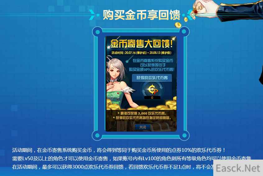 活动期间,在金币寄售系统购买金币,将会得到等同于购买金币所使用的点券10%的欢乐代币券! 需要Lv50及以上的角色才可以使用金币寄售,如果账号内有Lv100的角色则所有等级角色均可以使用金币寄售。 在活动期间,最多可以获得3000点欢乐代币券回馈,若回馈欢乐代币券不足1点时,将不会发放奖励。 温馨提示 1、每个账号最多只能获得3000点欢乐代币券回馈 2、活动中获得欢乐代币券删除时间与其它欢乐代币券相同 |