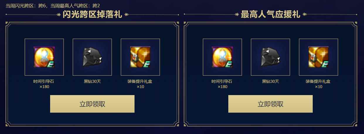 本周跨区战队的争夺愈演愈烈,旭旭宝宝带领的跨6好哥哥战队荣获当周闪光跨区之名,而人气最高跨区则由美女主播晴子率领的金光闪闪战队获得。玩家为跨区战队支持,可获得精美好礼,闪光跨区和人气最高跨区的应援玩家都可获得时间引导石180个、黑钻30天、装备提升礼盒10个,而在Hello语音当中投票也能获得精美奖励。